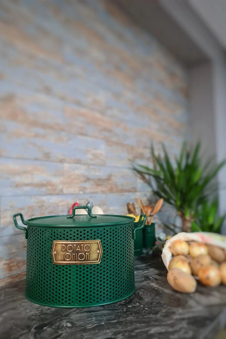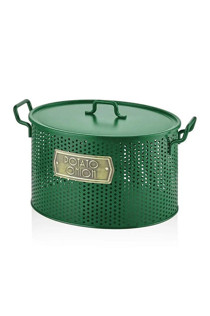 - The Mia Galvanized 24x46cm 2-Piece Potato-Onion Bucket dark green GLV0661 It has a double chamber inside. It is made of galvanized steel. It has holes against mold. It is suitable for outdoor use and does not rust or stain. Product size is 24(H) x 46(W) 30(D) cm.