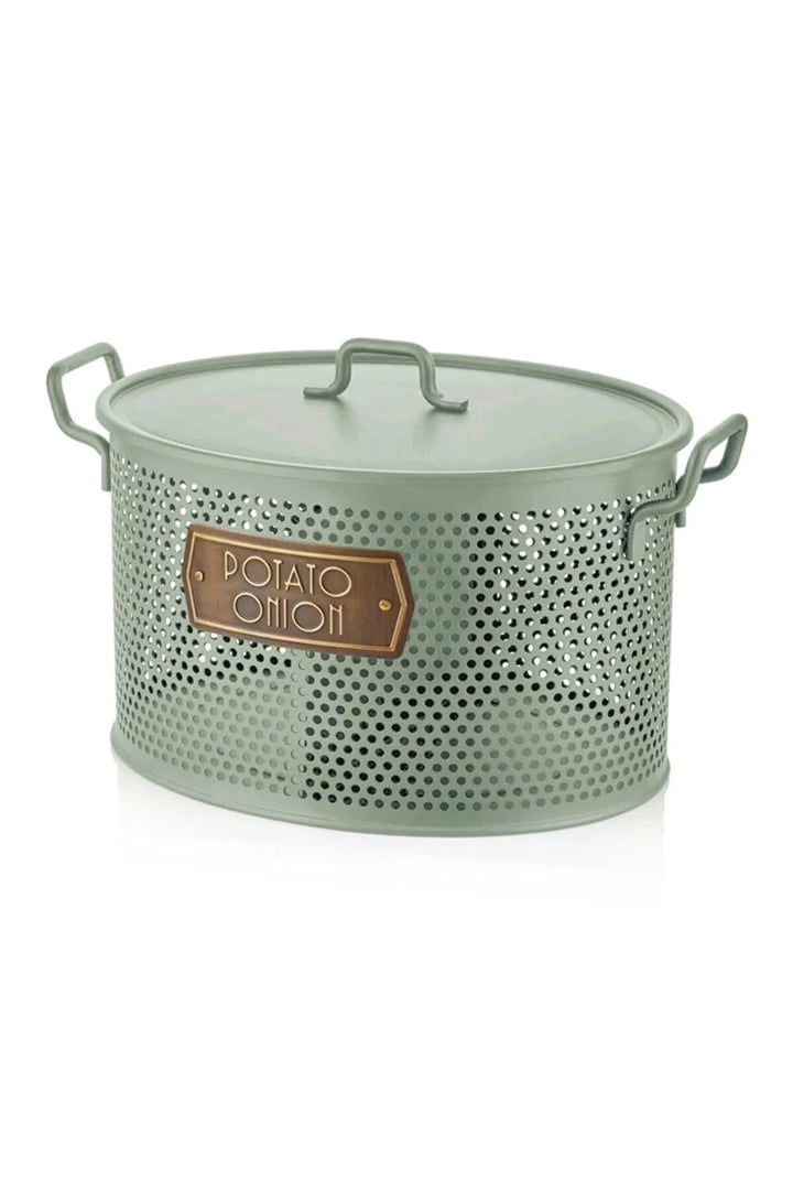 - The Mia Galvanized 24x46cm 2-Piece Potato-Onion Bucket greenGLV0661 It has a double chamber inside. It is made of galvanized steel. It has holes against mold. It is suitable for outdoor use and does not rust or stain. Product size is 24(H) x 46(W) 30(D) cm.