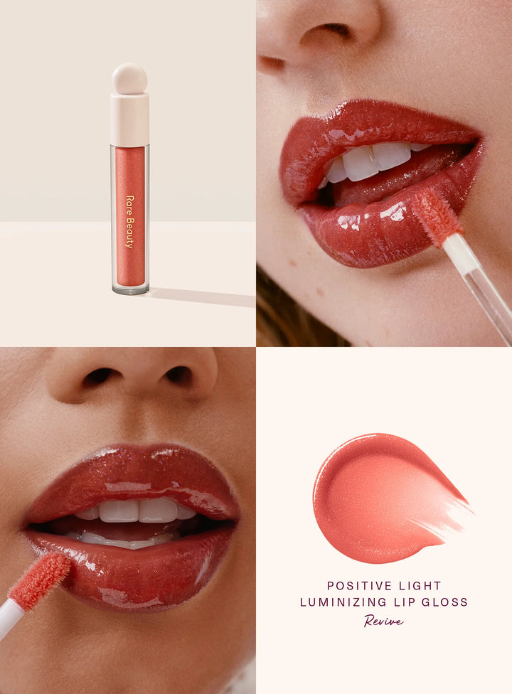 Positive Light Luminizing Lip Gloss in brand new, limited-edition shade Revive (peachy nude with gold and pink pearl) veils lips with smooth, prismatic shimmer and glass-like shine while hydrating lips with pure comfort—zero stick—all day.
