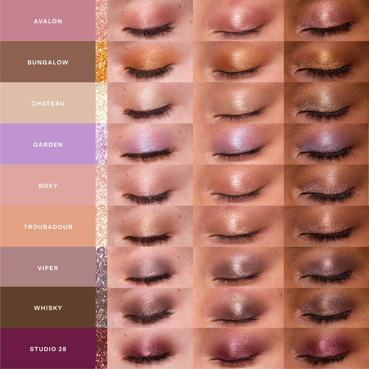 Troubadour Golden Amber, Chateau Champagne, Roxy Golden Pink, Avalon True Pink, Whisky Chocolate Brown, Viper Cool Mauve, Bungalow Gold, Garden Bright Purple, Studio 28 Plum |