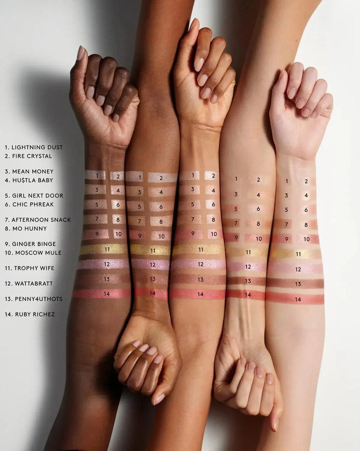 WATTABRAT - 3D BABY PINK SHIMMER, LIGHTNING DUST/FIRE CRYSTAL - SOFT PEARLESCENT SHEEN / SUPERCHARGED PEARLESCENT SHIMMER, MEAN MONEY/HU$TLA BABY - SOFT CHAMPAGNE SHEEN / SUPERCHARGED PEACHY CHAMPAGNE SHIMMER, GIRL NEXT DOOR/CHIC PHREAK - SOFT PINK SHEEN / SUPERCHARGED PEACHY PINK SHIMMER, GINGER BINGE/MOSCOW MULE - SOFT COPPER SHEEN / SUPERCHARGED COPPER SHIMMER, AFTERNOON SNACK/MO' HUNNY - SOFT BRONZED CHAMPAGNE / SUPERCHARGED BRONZE CHAMPAGNE SHIMMER, TROPHY WIFE - 3D HYPER-METALLIC GOLD, PENNY4UTHOTS - METALLIC BURNT COPPER, RUBY RICHEZ - METALLIC BRICK RED |