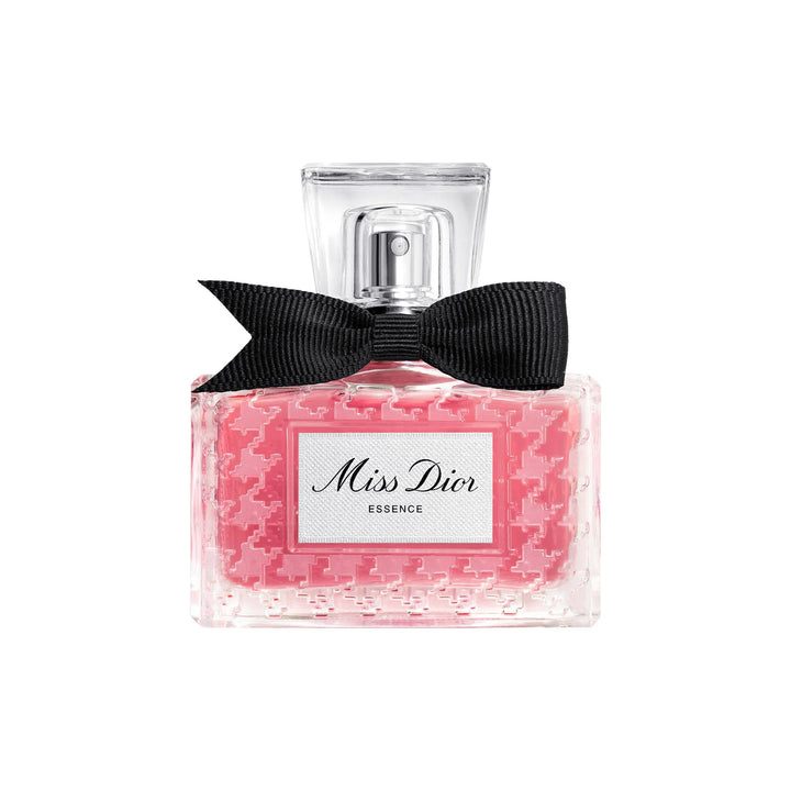 About the Bottle: Staying true to its iconic heritage while embracing a modern twist, Miss Dior Essence is housed in a reinterpretation of the heritage bottle first designed by Christian Dior in 1948. A frosted houndstooth motif lends timeless elegance, while a black couture poignard bow, made in France, adorns the glass cap.