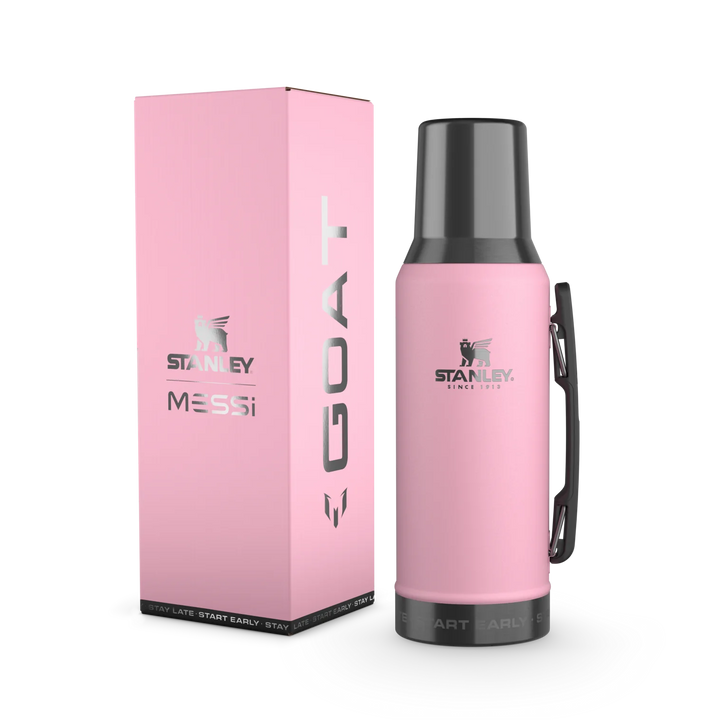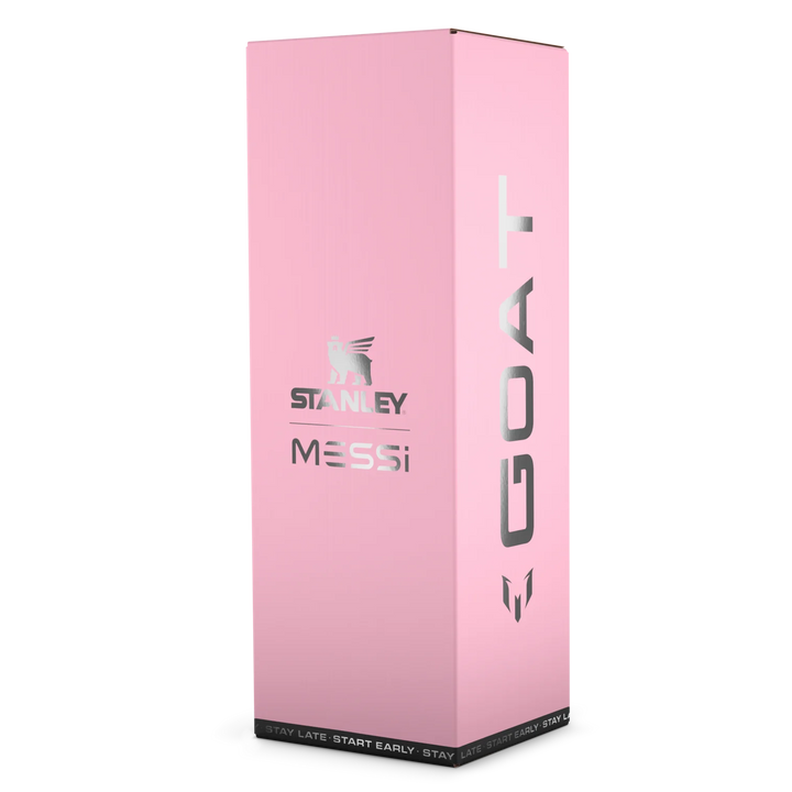 Start early, stay late with the Messi x Stanley GOAT Collection. Hydrate in black metallics and Messi GOAT Pink. The 1.3-quart High Precision Flow Mate System features a unique stopper. No twisting needed as the trigger button gives you a continuous pour. Shaped like a mate gourd, the insulated lid doubles as a mug so you can fuel your dedication on and off the pitch.