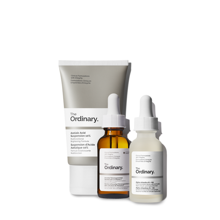 The Uneven Skin Tone Collection incorporates Azelaic Acid, Alpha Arbutin, and Vitamin C formulas to brighten and improve the appearance of uneven skin tone. These three ingredients can be layered together, or separately, so you can find the best options for your regimen.